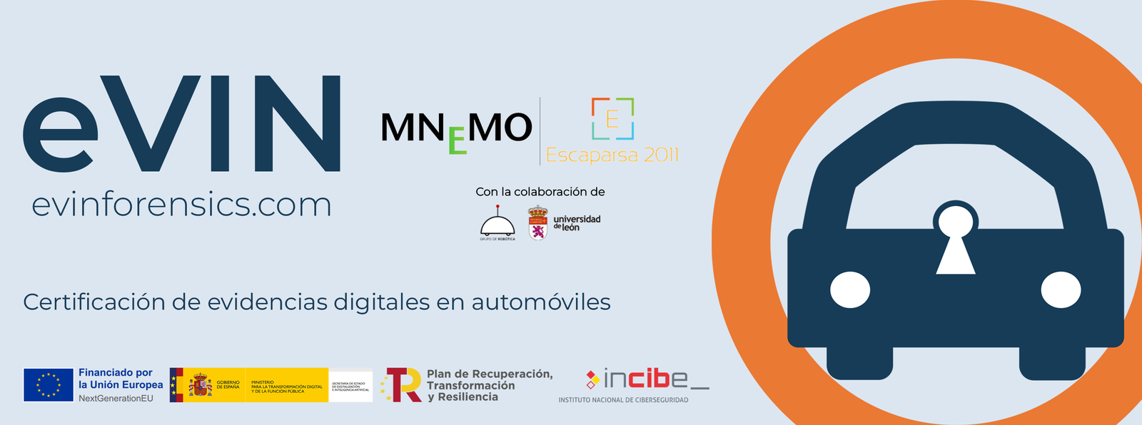 El sistema eVIN ha sido desarrollado por la UTE MNEMO-ESCAPARSA con la colaboración del Grupo de Robótica de la Universidad de León, con financiación del Instituto Nacional de Ciberseguridad (INCIBE), entidad dependiente del Ministerio para la Transformación Digital y de la Función Pública, a través de la Secretaría de Estado de Telecomunicaciones e Infraestructuras Digitales.